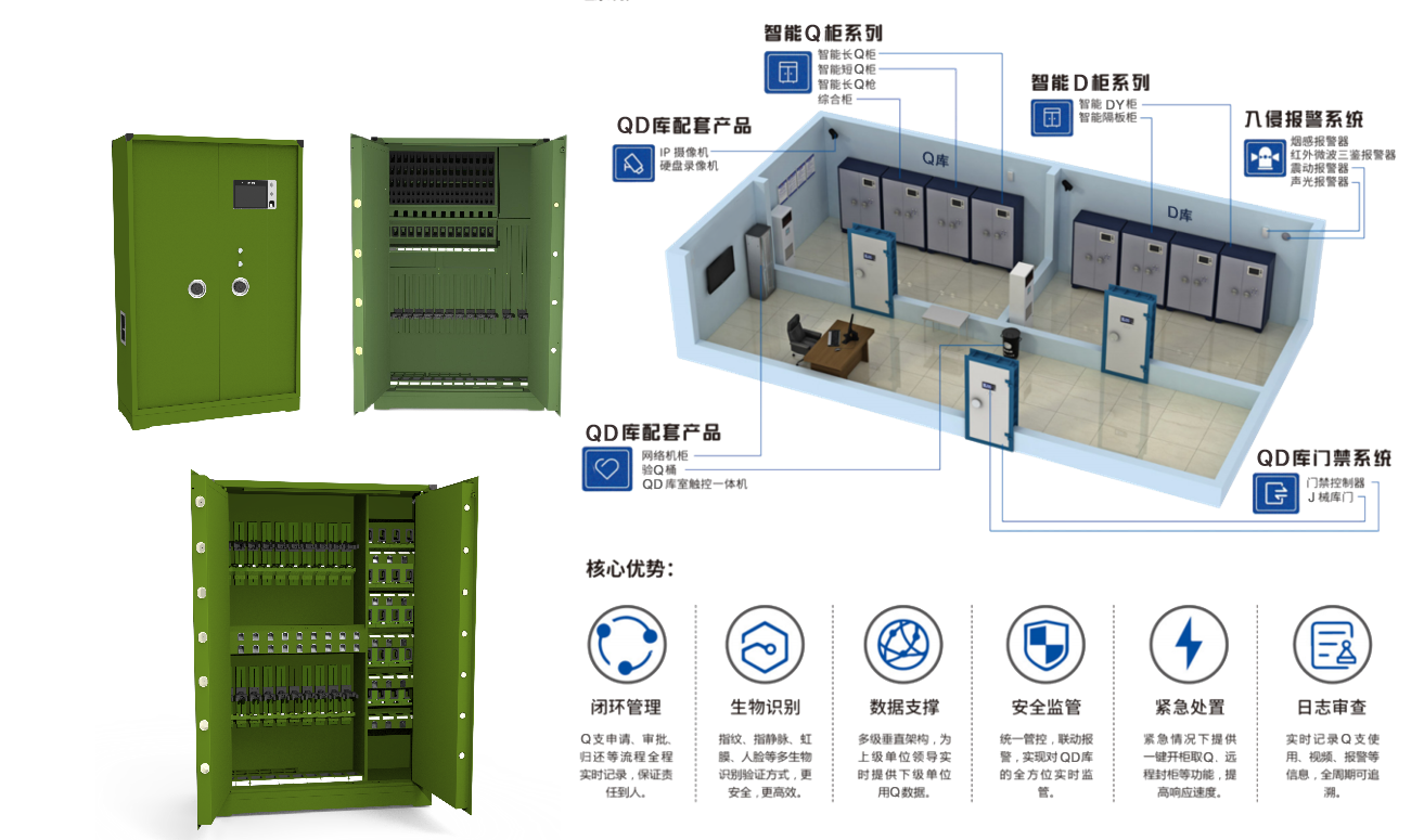 基于自研出入库管理系统,包含出入口控制、视频监控、入侵报警、智能联控QD柜及环境控制五大控制系统